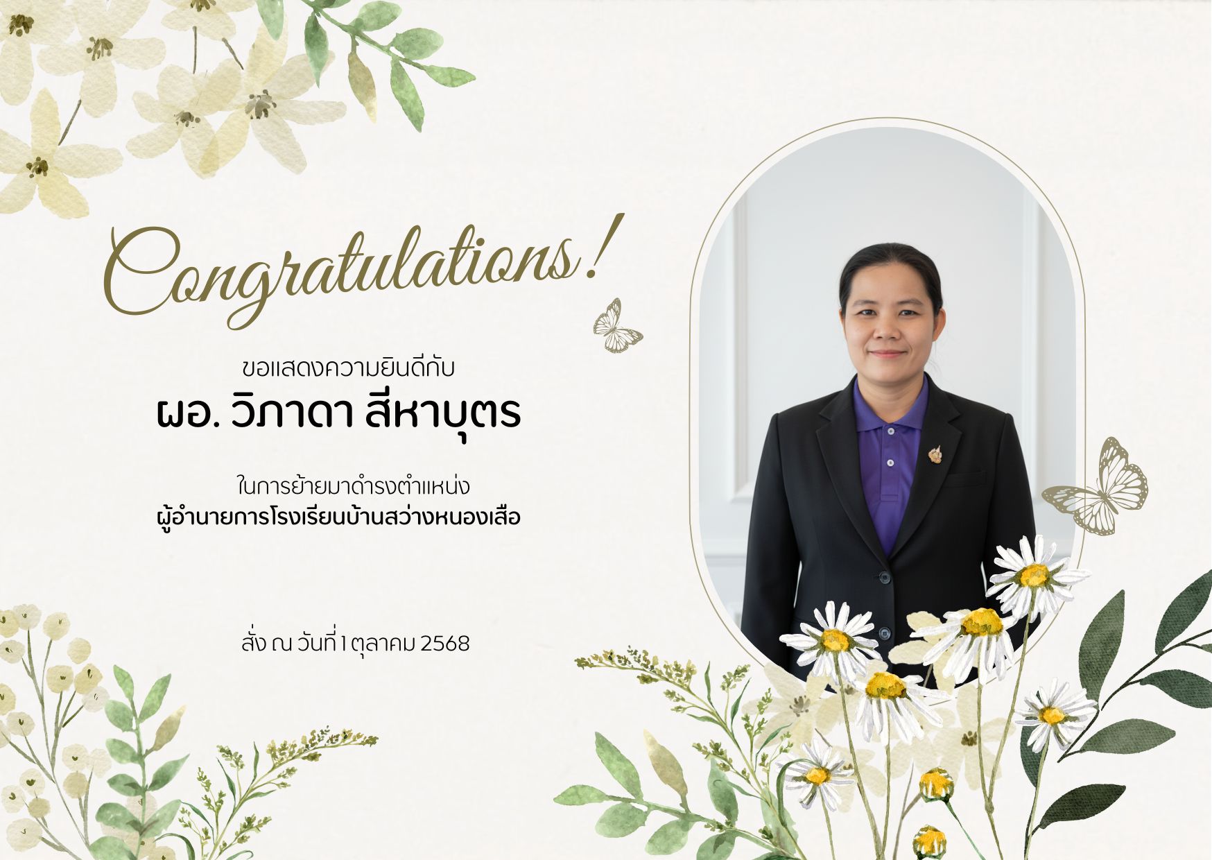 ขอแสดงความยินดี กับ นางวิภาดา สีหาบุตร ในการย้ายมาดำรงตำแหน่ง ผู้อำนวยการโรงเรียนบ้านสว่างหนองเสือ สั่ง ณ วันที่ 1 ตุลาคม 2568
